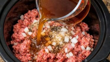 Pour beef broth over ground beef, together with 3 ingredients,