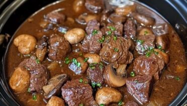 tender morsels of beef, slow-braised in deep red wine, nestled with pearl onions, earthy mushrooms, and aromatic herbs until the sauce is velvety, complex, and utterly intoxicating