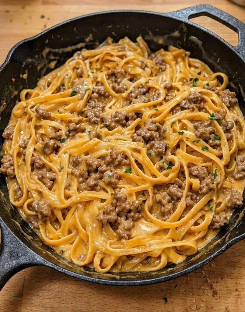 Savory ground beef, buttery garlic, silky cream sauce, and salty Parmesan all come together into a rich, cozy dish that tastes like pure comfort in a bowl.