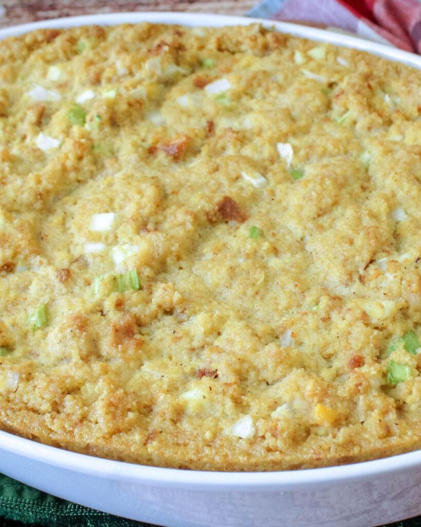 Imagine soft cornbread infused with savory chicken and turkey broth, little bites of onion and celery for texture, and that classic holiday hint of sage. It’s rich but not heavy. Flavorful but not overpowering. Anything but boring!!