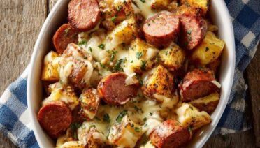 Oven-Baked Cheesy Sausage and Potato Bake This Oven-Baked Cheesy Sausage and Potato Bake is a simple, rustic sheet-pan meal.
