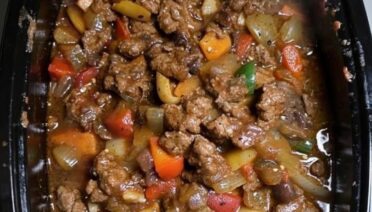 slow-cooker pepper steak—strips of beef (sirloin or stew meat) cooked with bell peppers and onions