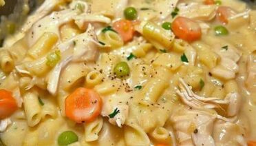 creamy crockpot chicken and noodles—shredded chicken, carrots, peas and egg noodles cooked in a creamy chicken broth in the slow cooker
