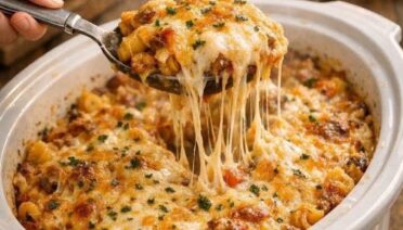 Slow Cooker Million Dollar Pasta—a cheesy ground-beef pasta bake made in the crockpot